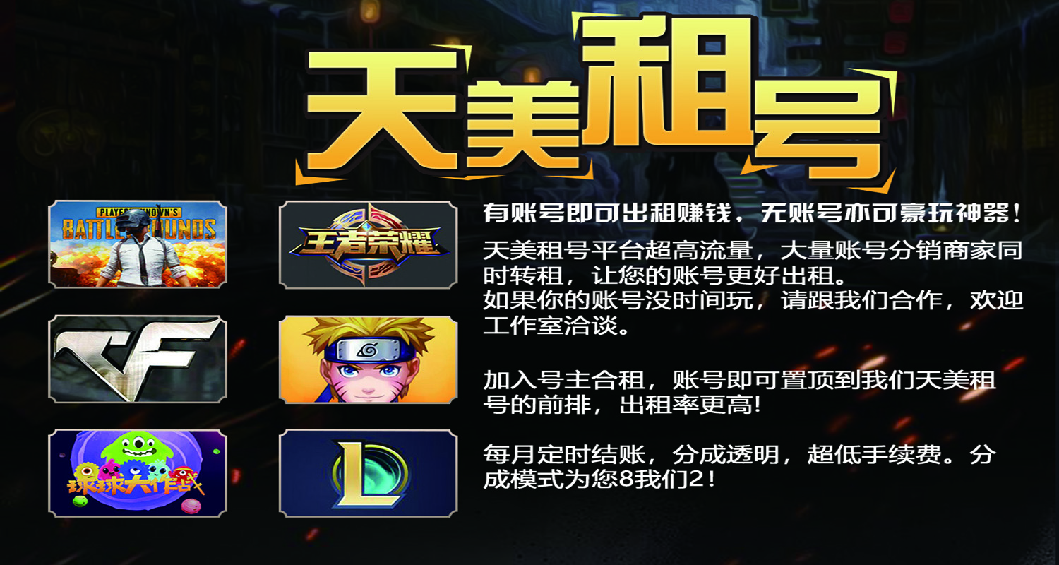大量账号分销商家同时转租,让您的账号更好出租。账号安全保障措施,外挂强制下线,扣除租金,防止外挂密码泄露等,安全稳定! ! !