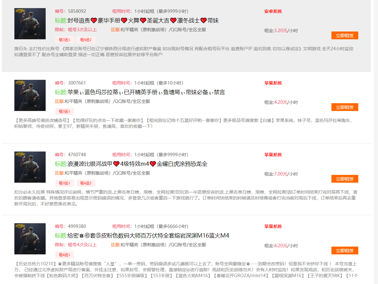 全网游戏账号租用领跑平台, 百万游戏账号出租和平精英